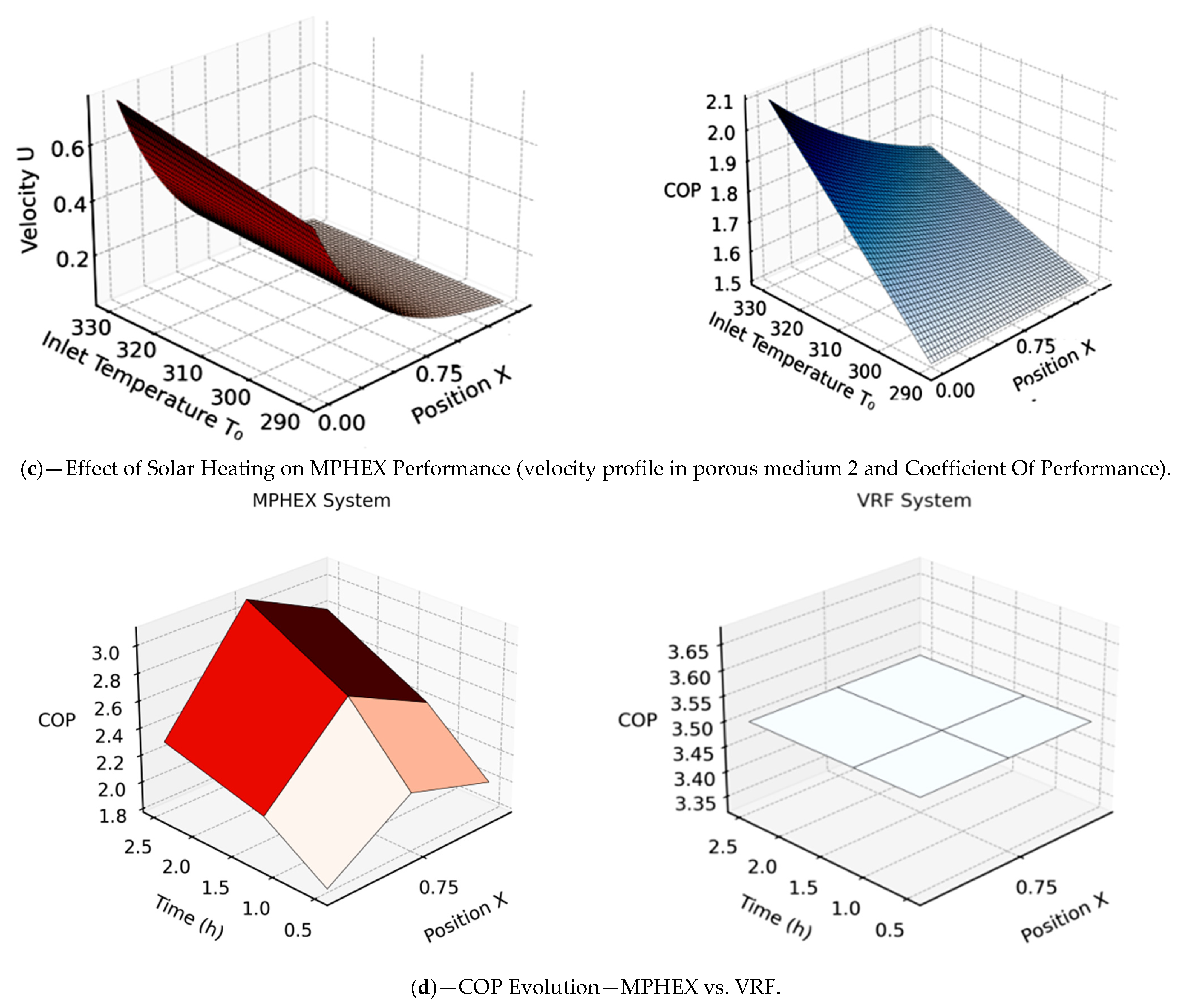 0. In parallel, COP evolution along the flow path (5.e) shows that, while VRF systems maintain a constant COP through active regulation, MPHEX performance rises progressively due to passive adaptation of its porous structure to changing thermal and hydrodynamic conditions. Notably, the COP gain in MPHEX is self-generated without any additional power input, whereas VRF’s stability comes at the cost of higher electrical consumption and system complexity. This means that under favorable inlet temperature conditions, MPHEX can match or even surpass VRF efficiency in steady state operation. As a result, the combination of thermal preheating and structural adaptability positions MPHEX as a credible, low maintenance, and energy resilient alternative for sustainable cooling in sun rich climates.