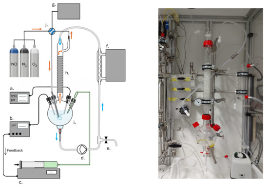 Schematic representation of the NOx scrubber experimental setup (left). (a) pH and temperature monitoring; (b) pH controller; (c) KOH solution pump; (d) recirculation pump; (e) scrubber solution sample valve; (f) cryostat; (g) NOx gas analyzer; (h) absorption column filled with packing material; (i) round bottom flask with probe inlets; (j) bypass valve (→) direction of gas flow (→) direction of liquid flow. Photo of the real setup on the (right).