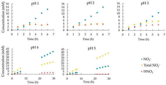The nitrate, nitrite and total nitrite concentrations, standing for the sum of NO2− and HNO2 in the scrubber solution, were determined at 1 h time intervals (Figure 3). Experiments at pH 4 and 5 were run over two days. No liquid samples were taken during the night. The nitrate concentration steadily increased for all the five experiments at different pH values. At the end of the testing period, the nitrate concentration in the scrubber solution reached values of 12.6 mM at pH 1; 14.0 mM at pH 2; 10.4 mM at pH 3; 40.3 mM at pH 4; and 14.9 mM at pH 5 (Figure 3 and Table 1). However, it is important to note that tests at pH 4 and 5 ran for 30 h instead of 6 h. Table 2 illustrates the NO3− concentration for tests at pH 1–5 after 6 h. After the same amount of scrubbing time, NO3− concentrations reached 12.63 mM at pH 1 while only 2.97 mM was reached at pH 5. The nitrate accumulation rate decreased with increasing pH value.