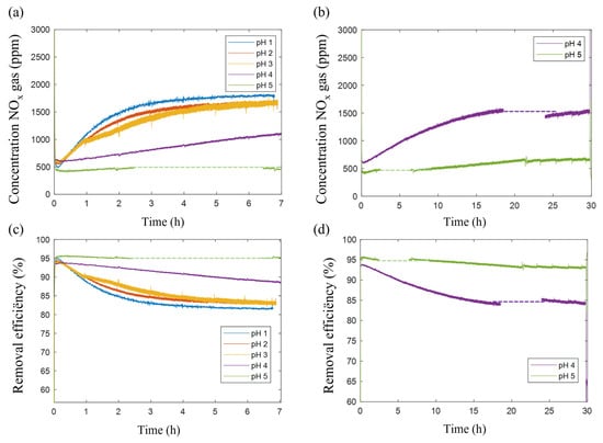 The NOx concentration in the gas exiting the scrubber under the different pH conditions is presented in Figure 4a,b. In experiments at pH 1, 2 and 3, NOx outlet concentrations initially were around 800 ppm, and increased during the experiment until a plateau value of ca. 1800 ppm was reached. The corresponding NOx removal efficiency decreased from ca. 95% initially, to 82.5%, 83.9% and 83.0% at pH 1, 2 and 3, respectively (Figure 4c).