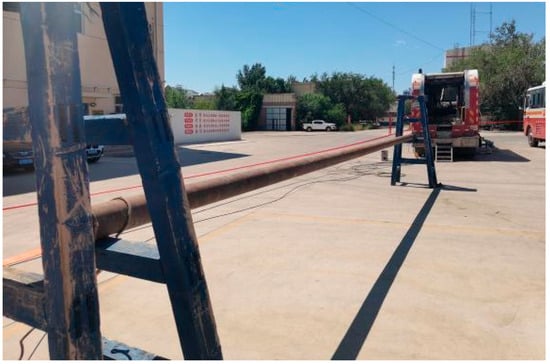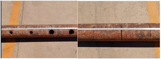 The horizontal well bore simulation employed a 32.38 ft (9.87 m) long, 5.5-inch (139.7 mm) diameter casing section with a 0.304 in (7.72 mm) wall thickness. Each casing section has a total length of 32.38 ft (9.87 m), with damage (i.e., holes and cracks) distributed over 8.300 ft (2.53 m) (Figure 2 and Figure 3). Holes of varying diameters (1.949 in (49.5 mm) and 1.173 in (29.8 mm)) were designed, spaced at ~7.677 in (195 mm) intervals. The cracks were designed in vertical and horizontal structures, measuring 1 and 3 cm in width, respectively. These diverse damage patterns allowed us to comprehensively evaluate the 40-arm caliper logging tool’s response under both centralization and eccentricity conditions.
