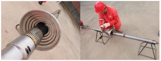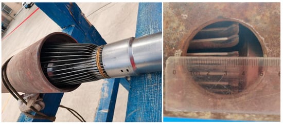 To simulate MIT response in horizontal wells, we conducted experiments using a 40-arm caliper logging tool at the Xinjiang Branch of China National Logging Group Co., Ltd., Karamay District, Xinjiang Uygur Autonomous Region, China. The experimental system consists of the ground information acquisition system, signal control and transmission system, 40-arm caliper logging tool, casing with different inner diameters, and damage designs. The 40-arm caliper logging tool (Figure 1) (WELL-SUN Company, Xi’an Shanxi, China) features an outside diameter of 2.875 in (73.03 mm) and a length of 61.97 in (1574.04 mm). The tool measurement range spans from 2.9 to 7.5 in (73.66–190.5 mm), with a radius measurement accuracy of ±0.03 in (±0.762 mm), and a resolution of 0.005 in (0.127 mm).