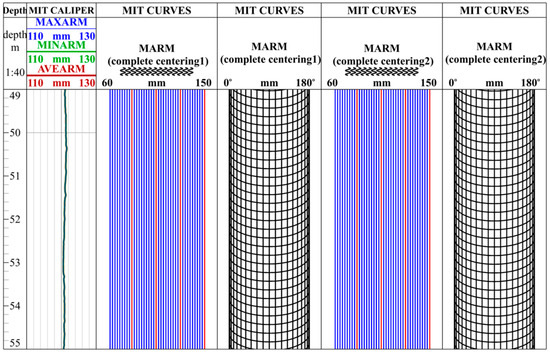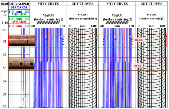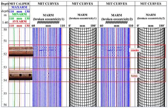 Figure 8 and Figure 9 illustrate the measurement curves of the instrument under central and eccentric conditions in a damaged casing. These curves demonstrate the extension of multi-caliper arms when the instrument passes through cracks and holes. At 51–52 m, the MIT curves of “broken eccentricity 1” and “broken eccentricity 2” on both sides present extensive extrusion signs, while the curve in the middle shows a pronounced increase, indicating casing damage at this position (Figure 8).