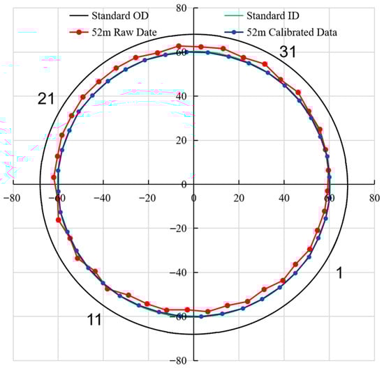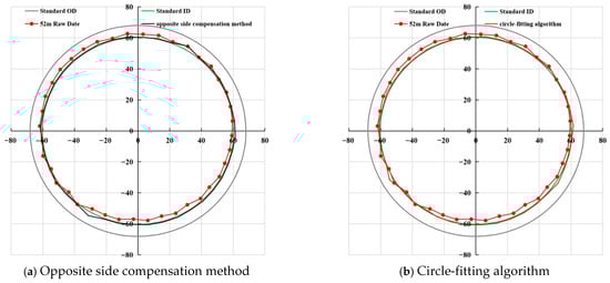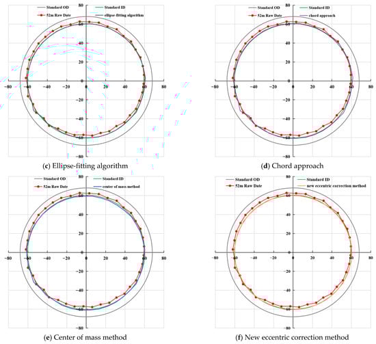 The cross-sectional views before and after eccentricity correction at a depth of 52 m under the condition of a damaged casing with a crack, are shown in Figure 10. When comparing the logging data before and after eccentricity correction, the 52 m raw data reveal an eccentric phenomenon (Figure 10). Instrument eccentricity can substantially cause misjudgment in the quantitative evaluation of oil and casing pipe damage. Therefore, establishing an accurate eccentricity correction method is crucial.