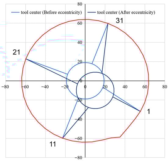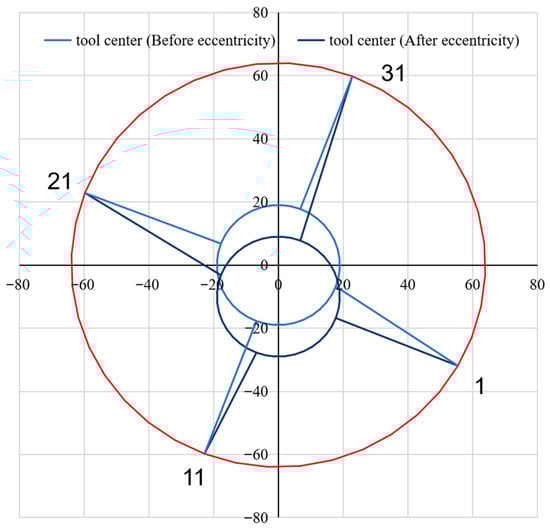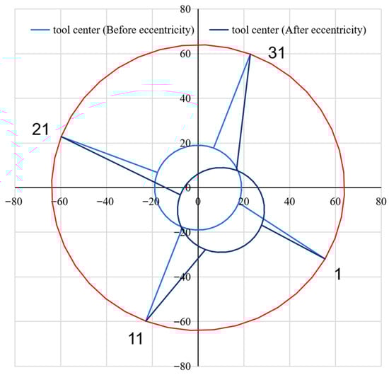 Finally, the eccentricity correction is completed based on the relationship between the tool center point coordinate (0, 0), the shaft center coordinates (), and the eccentric coordinate (xi′, yi′). Casing loss assessment is based on comparing the radius before eccentricity and the radius after correction.