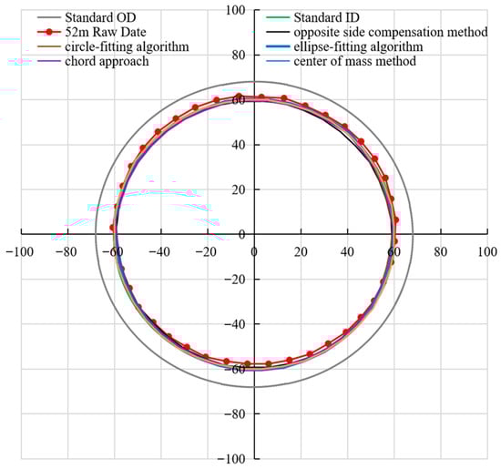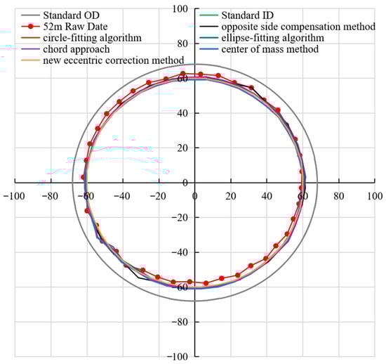 Comprehensive result diagrams of various eccentricity correction methods under instrument eccentricity and centering conditions in a damaged casing are shown in Figure 17 and Figure 18. In Figure 17, each method displays an excellent correction performance under the condition of instrument centering in a damaged casing, the correction curves match the standard inner diameter. However, under eccentric conditions (Figure 18), a pronounced upward deviation of the original data curve from the standard inner diameter is evident. Specifically, the caliper measurements on the upper side exceed the standard inner diameter, whereas those on the lower side fall short. This phenomenon also indicates that there is a significant eccentricity in the instrument. This observation aligns precisely with the eccentric condition illustrated in Figure 10. Our systematic study of the fitting correction methods reveals major differences in their effectiveness. In areas with normal well conditions, all the tested correction techniques align with the standard inner diameter with high precision, resulting in excellent fitting outcomes. However, in damaged casing areas, the chord method, the opposite side compensation method, the circle-fitting algorithm, and even the relatively advanced ellipse-fitting algorithm all exhibit obvious limitations. These methods struggle to accurately identify damage features, which appear as sharp peaks in the fitting curves and ultimately lead to the omission of damaged areas. In contrast, the newly established eccentric correction method completely avoids these problems.