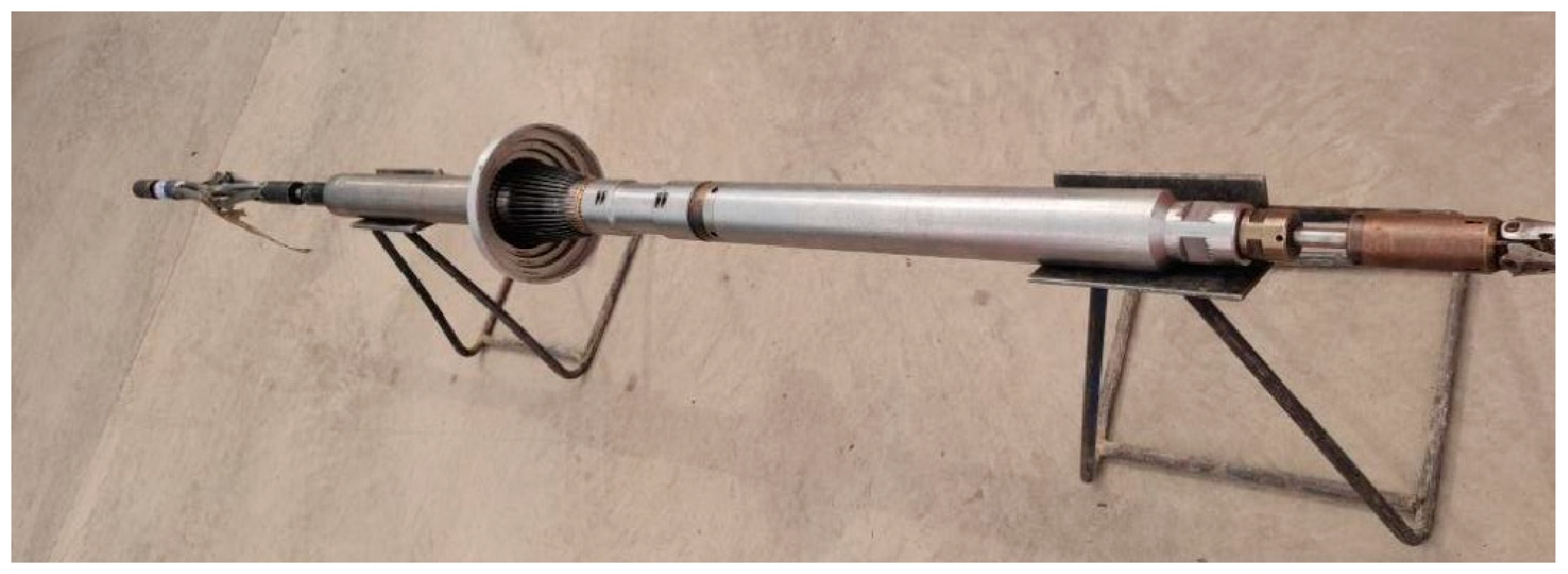 To simulate MIT response in horizontal wells, we conducted experiments using a 40-arm caliper logging tool at the Xinjiang Branch of China National Logging Group Co., Ltd., Karamay District, Xinjiang Uygur Autonomous Region, China. The experimental system consists of the ground information acquisition system, signal control and transmission system, 40-arm caliper logging tool, casing with different inner diameters, and damage designs. The 40-arm caliper logging tool (