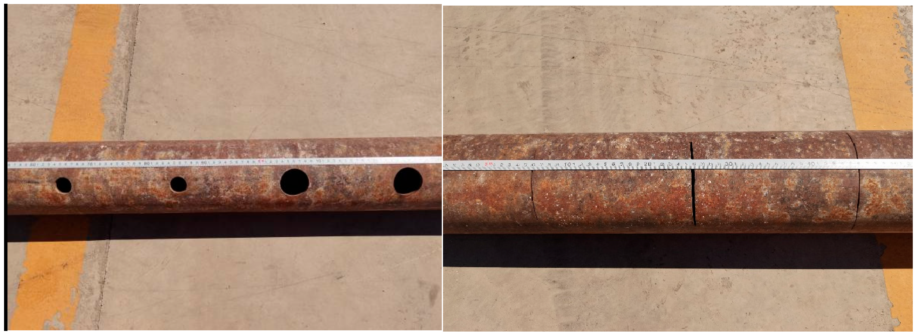 The horizontal well bore simulation employed a 32.38 ft (9.87 m) long, 5.5-inch (139.7 mm) diameter casing section with a 0.304 in (7.72 mm) wall thickness. Each casing section has a total length of 32.38 ft (9.87 m), with damage (i.e., holes and cracks) distributed over 8.300 ft (2.53 m) (
