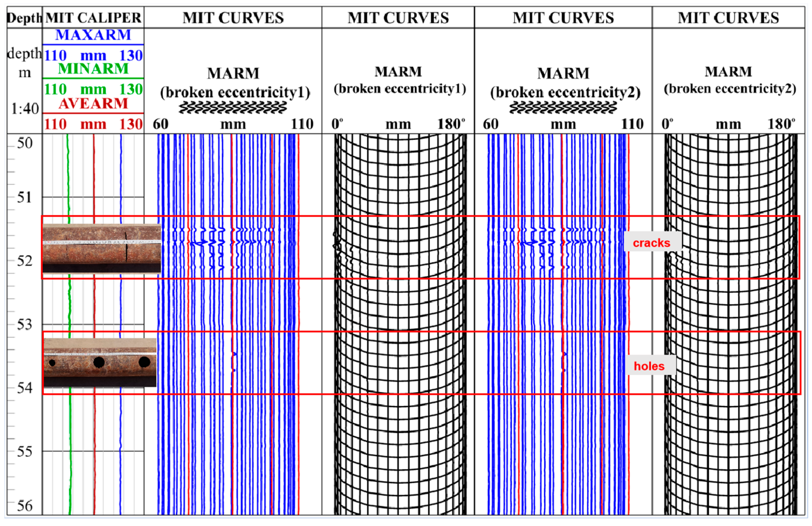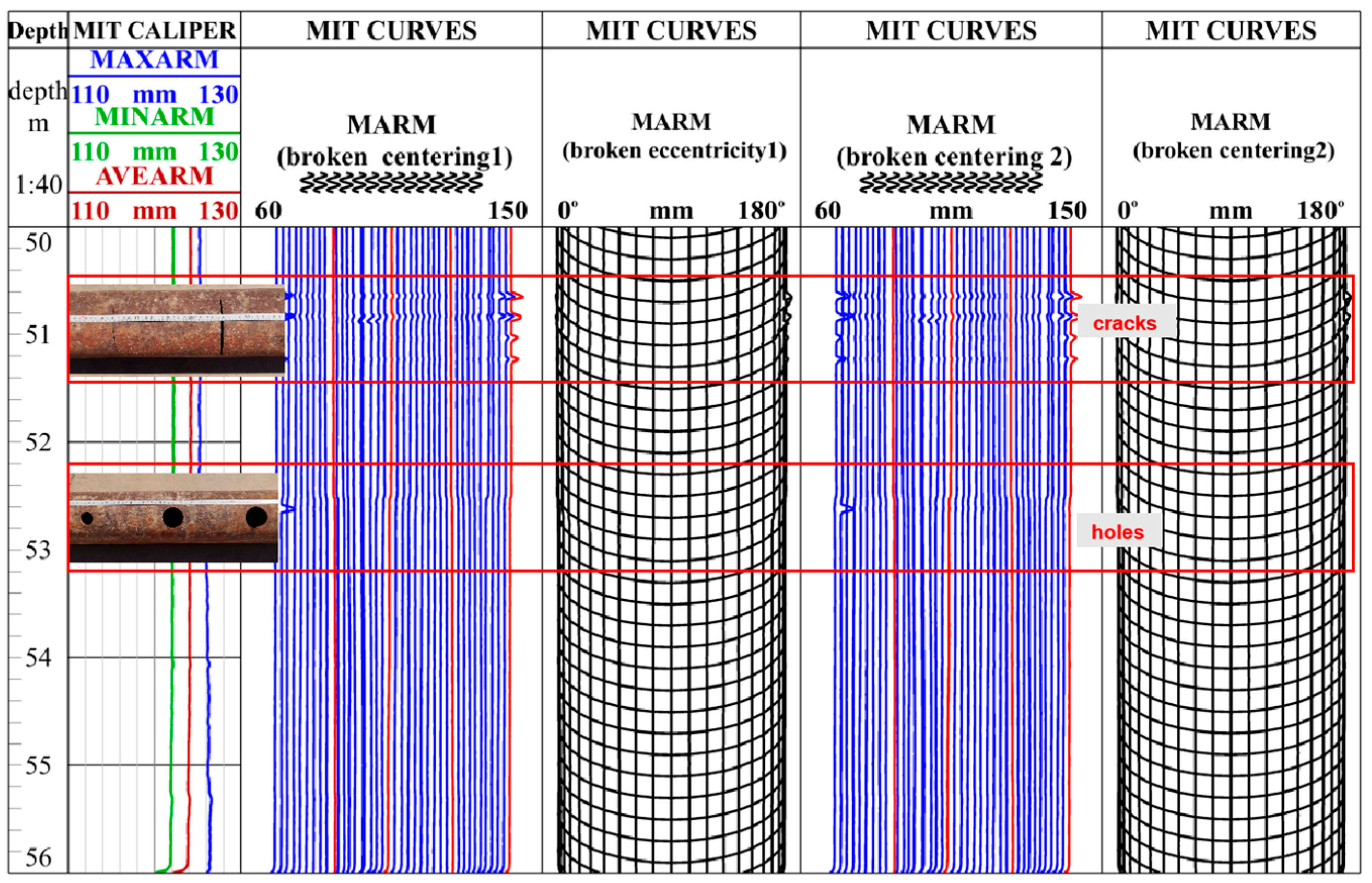 Figure 9 illustrate the measurement curves of the instrument under central and eccentric conditions in a damaged casing. These curves demonstrate the extension of multi-caliper arms when the instrument passes through cracks and holes. At 51–52 m, the MIT curves of “broken eccentricity 1” and “broken eccentricity 2” on both sides present extensive extrusion signs, while the curve in the middle shows a pronounced increase, indicating casing damage at this position (