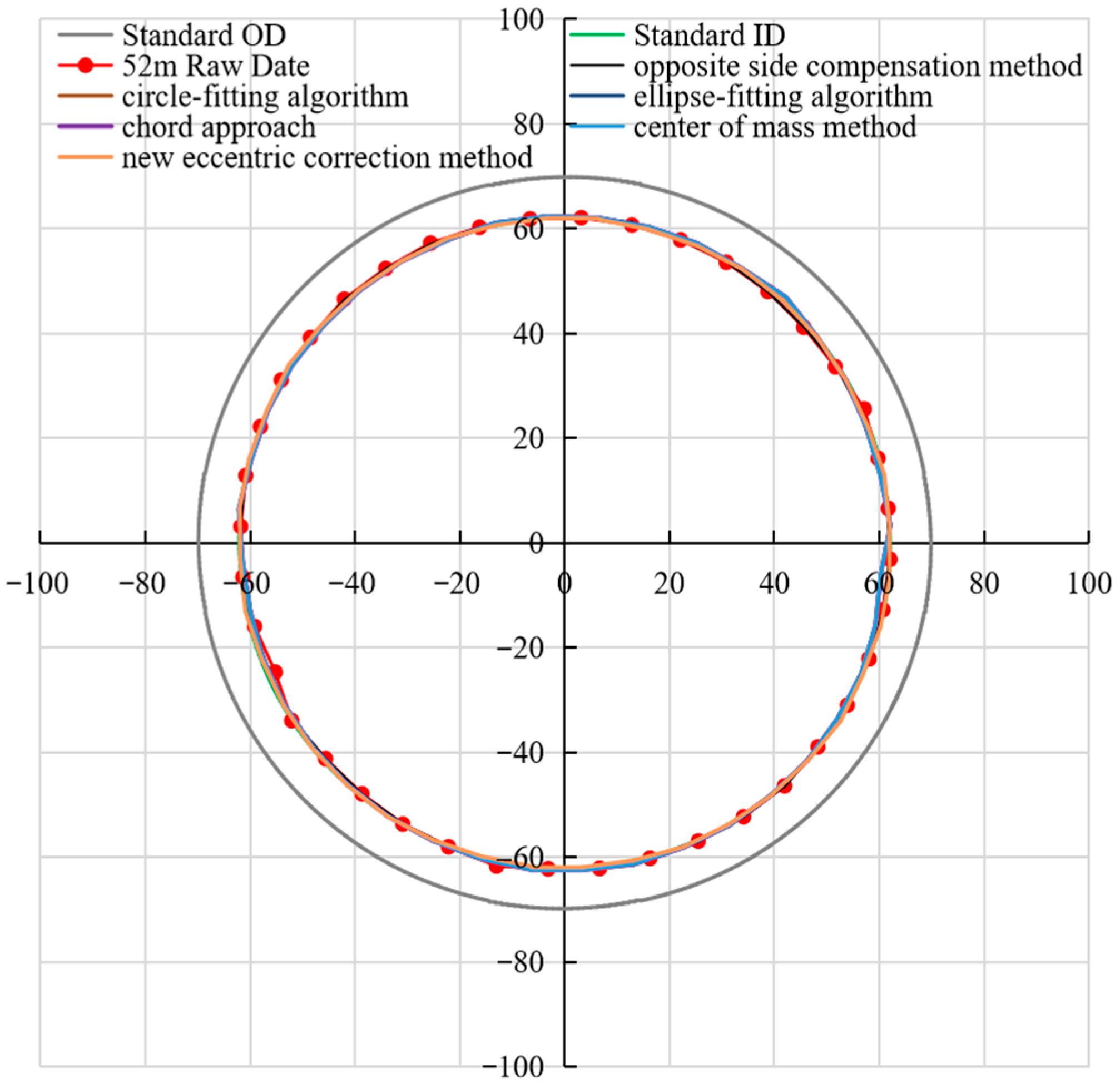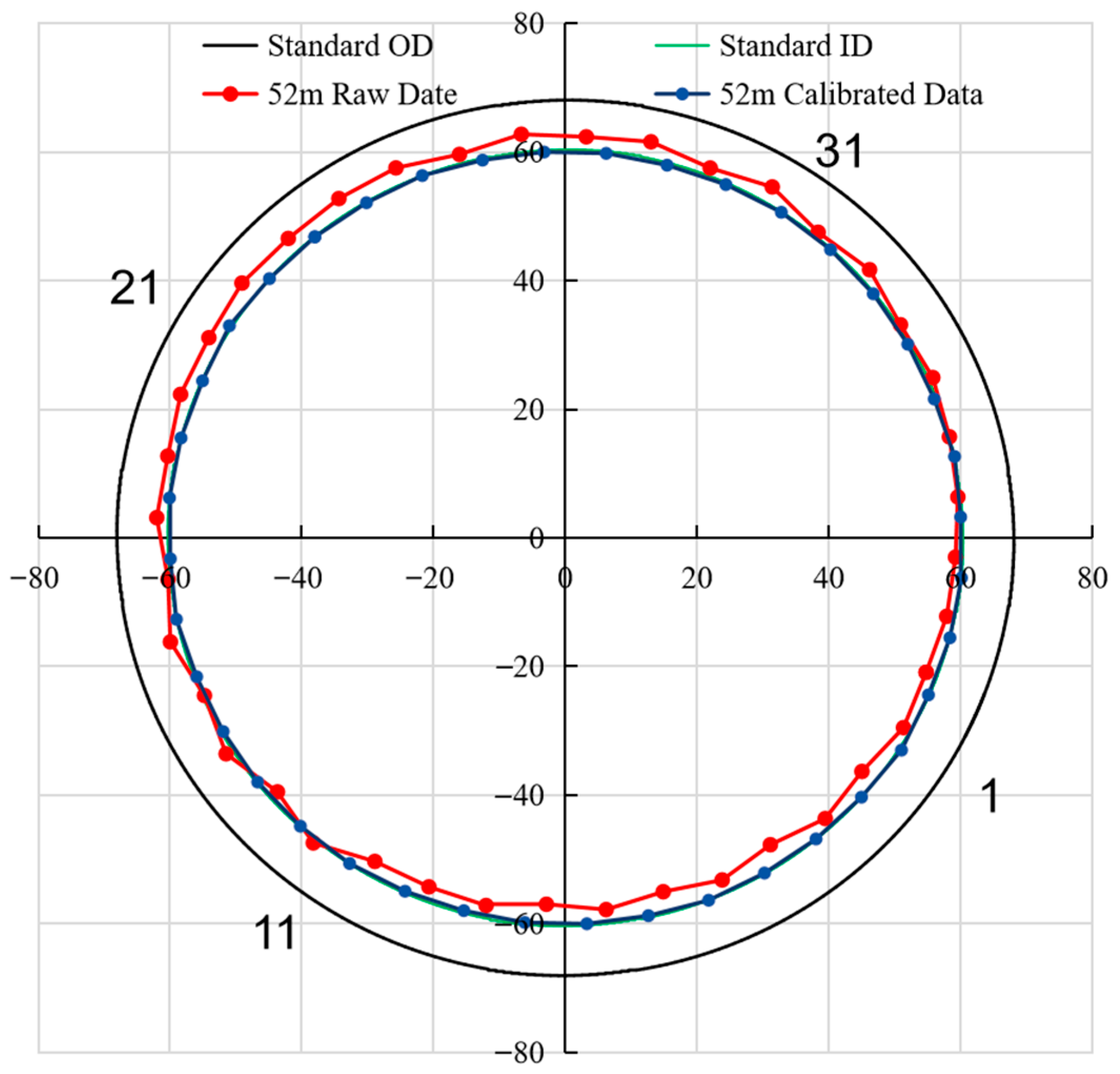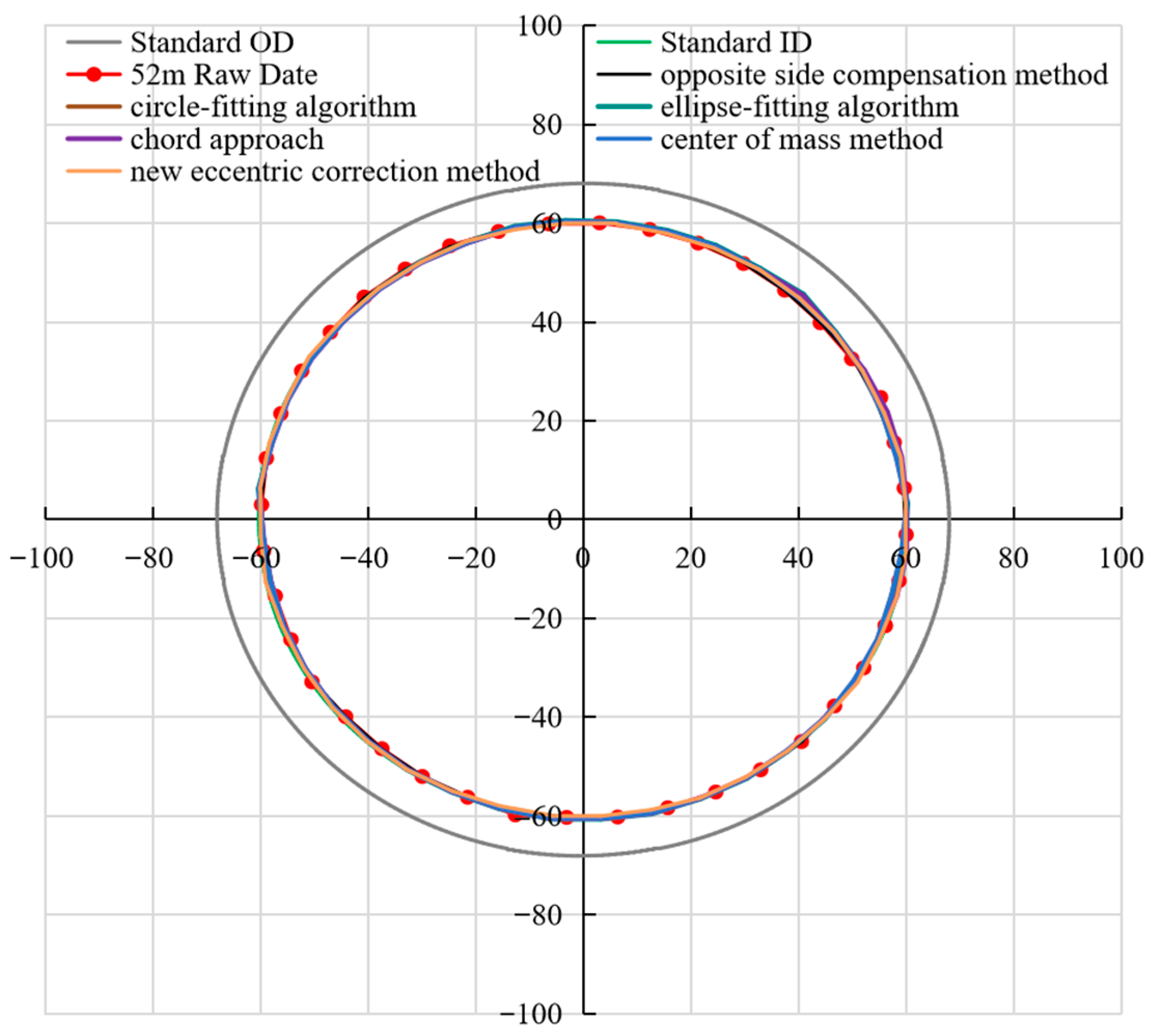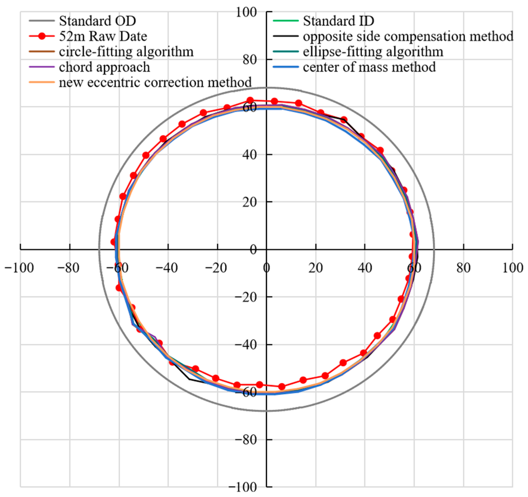 Figure 18), a pronounced upward deviation of the original data curve from the standard inner diameter is evident. Specifically, the caliper measurements on the upper side exceed the standard inner diameter, whereas those on the lower side fall short. This phenomenon also indicates that there is a significant eccentricity in the instrument. This observation aligns precisely with the eccentric condition illustrated in
