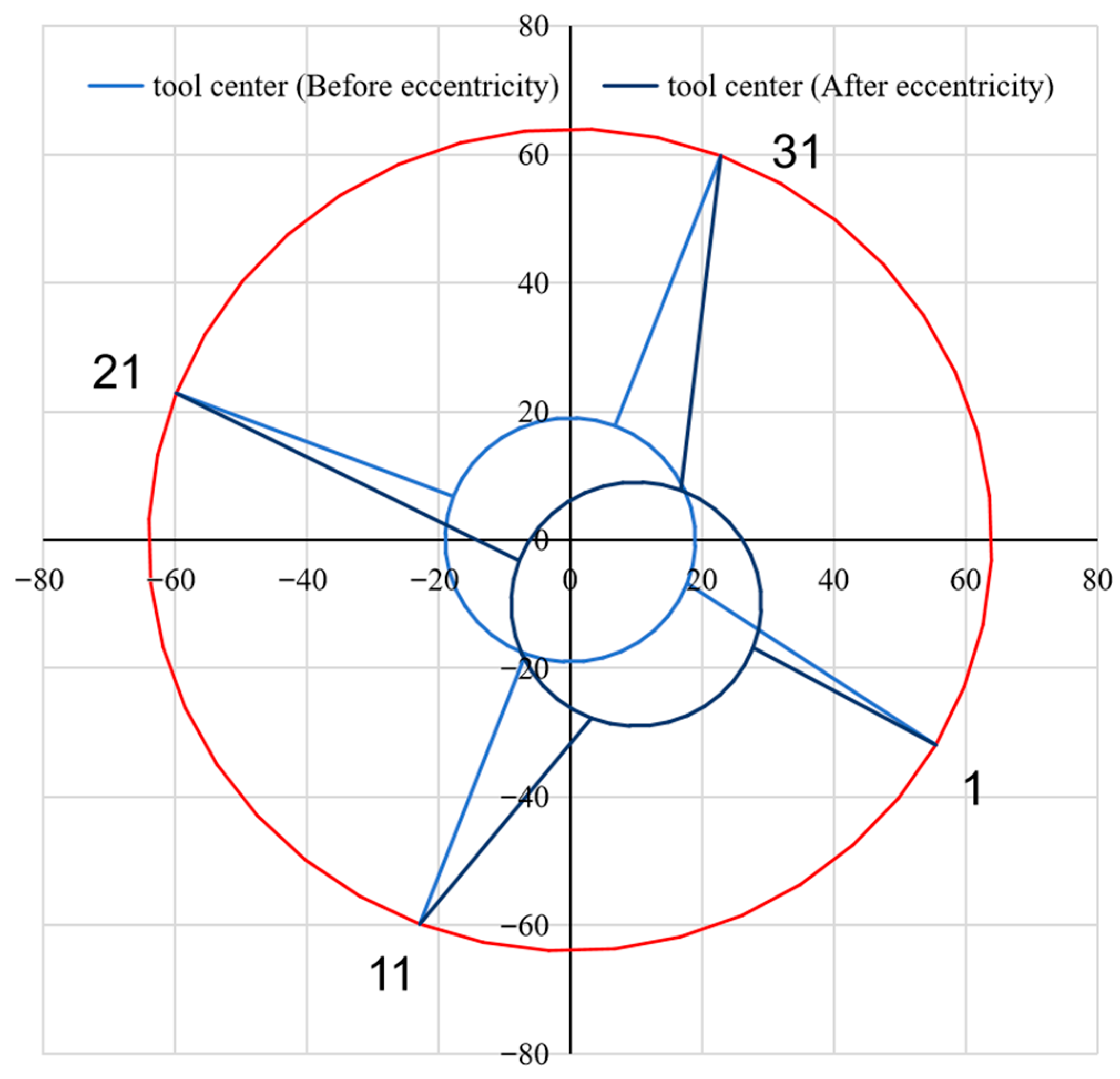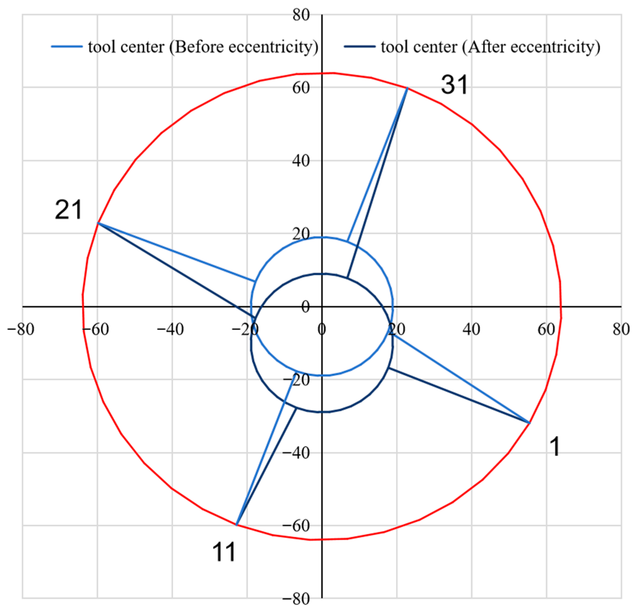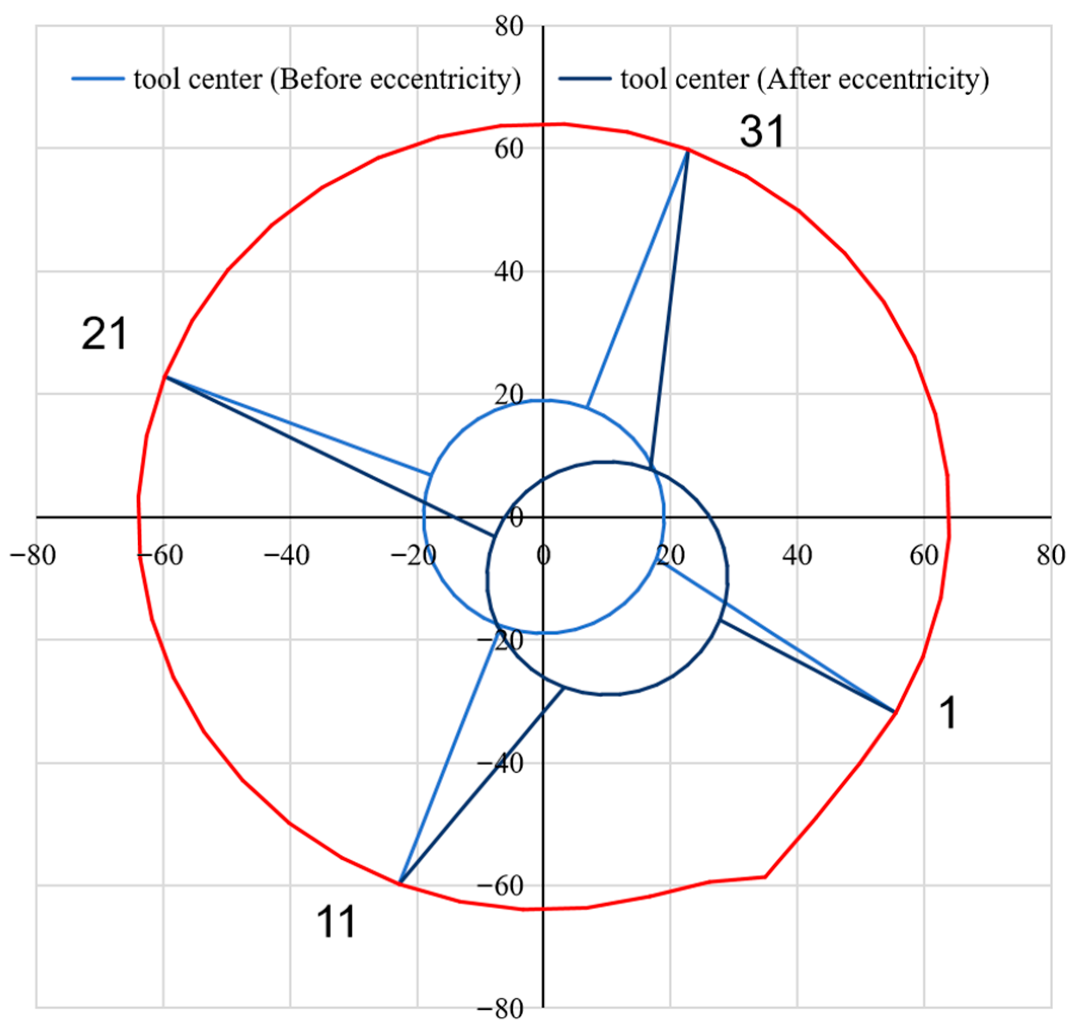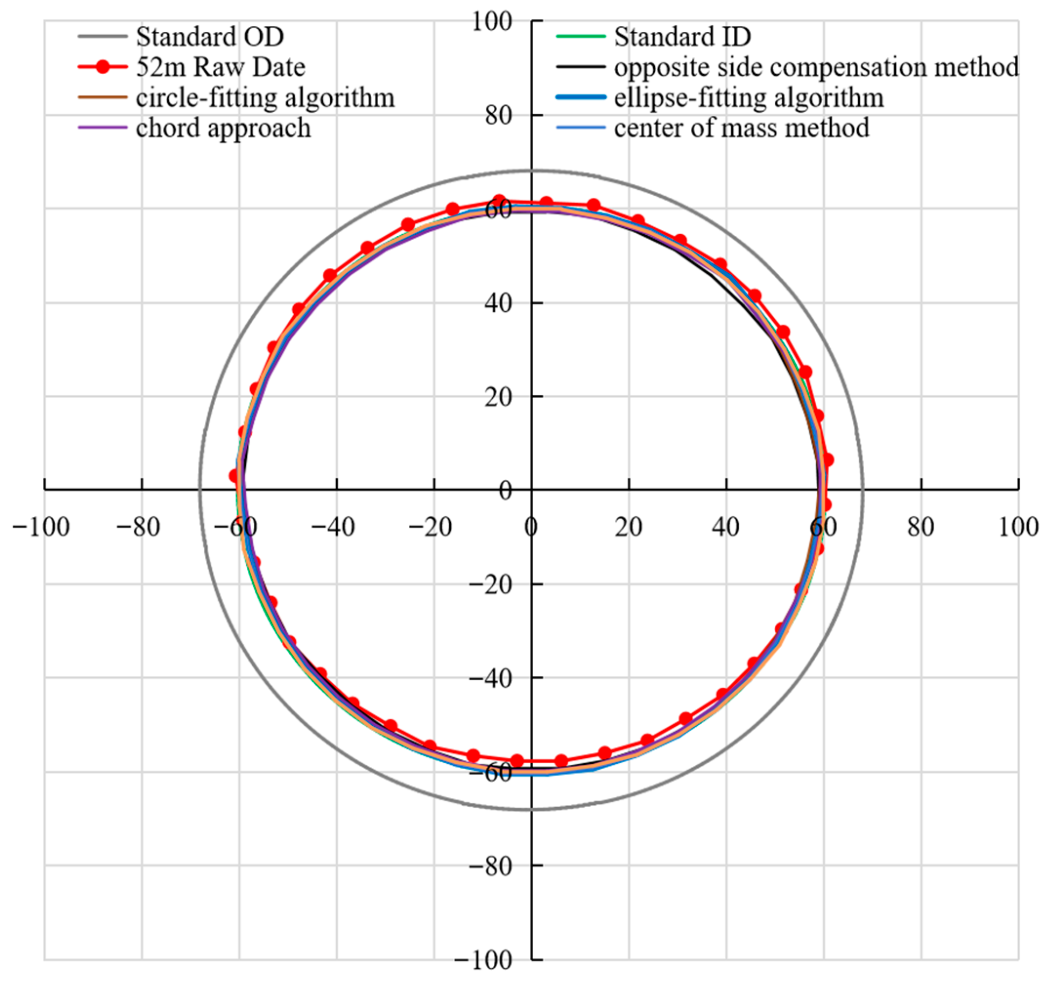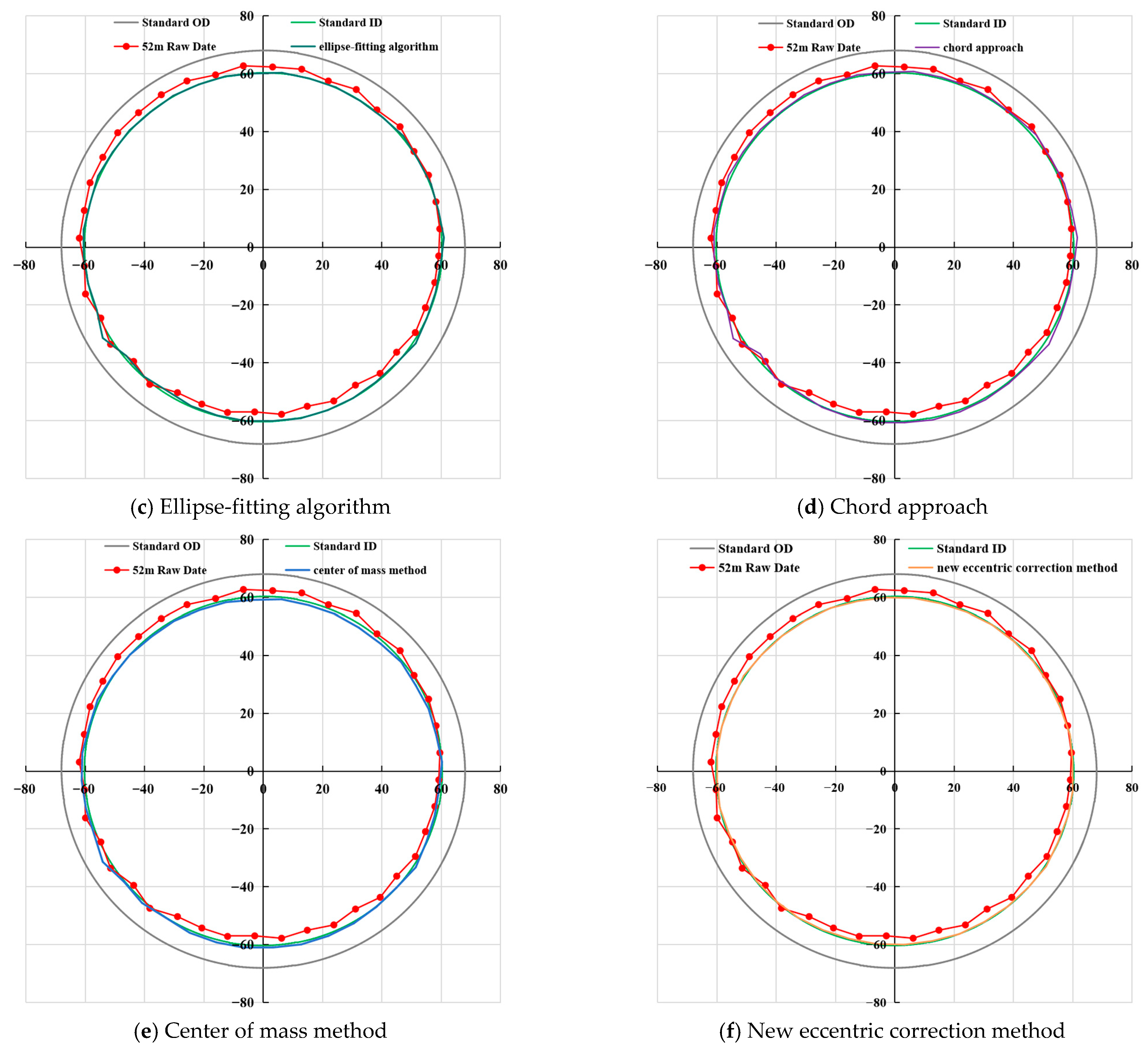 Figure 18), a pronounced upward deviation of the original data curve from the standard inner diameter is evident. Specifically, the caliper measurements on the upper side exceed the standard inner diameter, whereas those on the lower side fall short. This phenomenon also indicates that there is a significant eccentricity in the instrument. This observation aligns precisely with the eccentric condition illustrated in