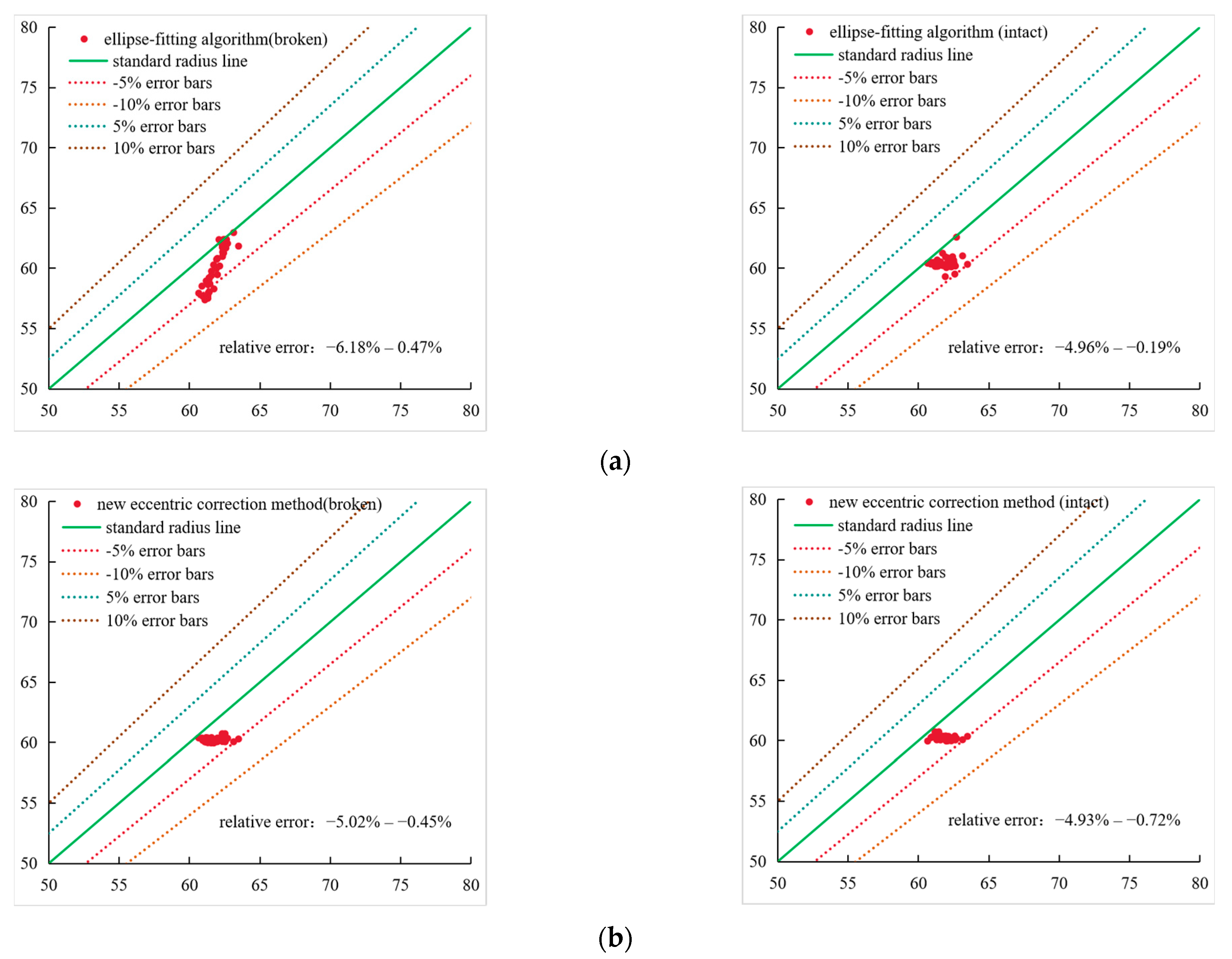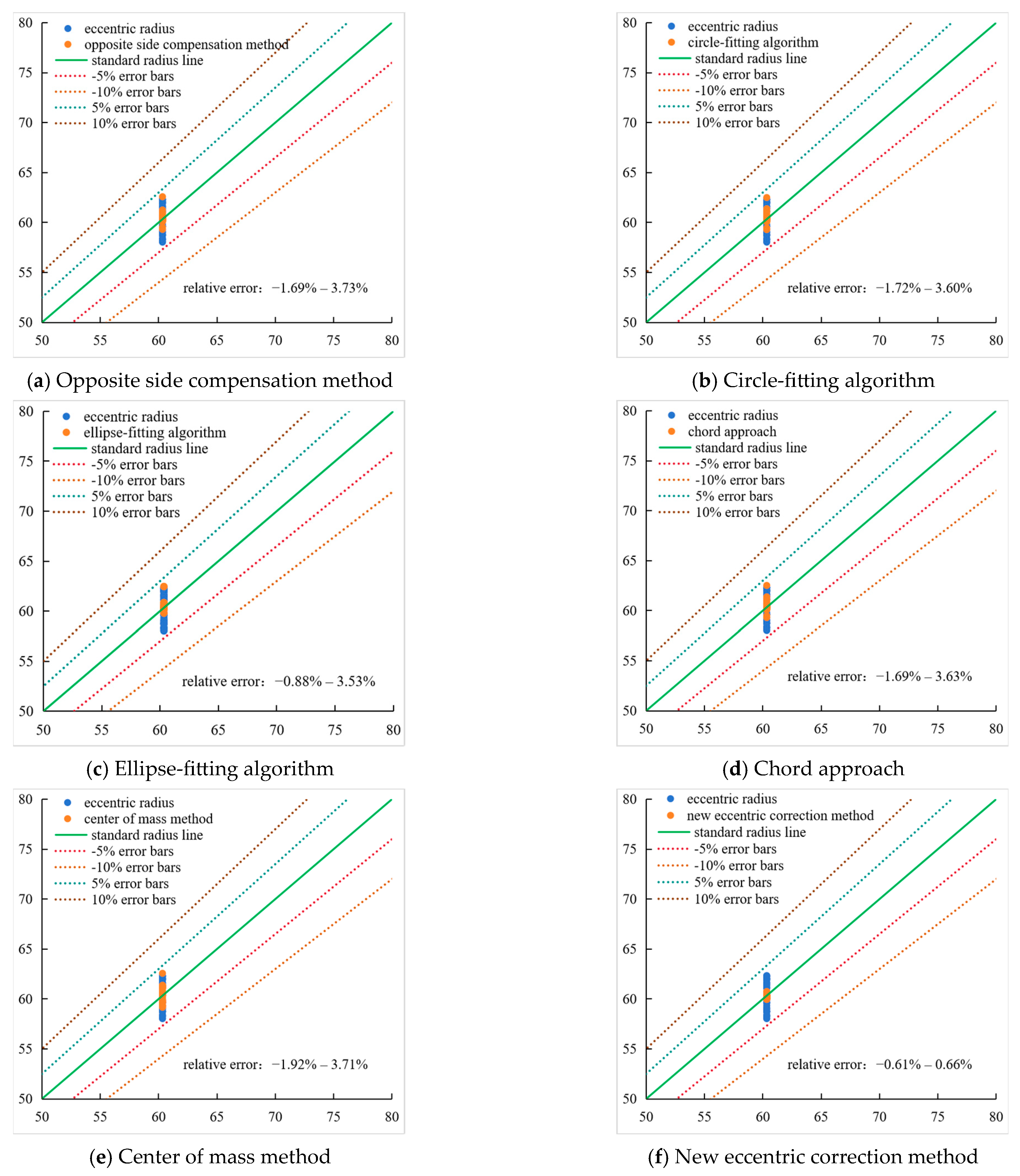 To further quantify performance disparities among correction methods and validate the advantages of the newly proposed method, this study conducted a systematic relative error analysis for each eccentric correction method. The results accurately reflect the differences in measurement accuracy and reliability among the methods, provide an important basis for evaluating their effectiveness in practical applications. The detailed data and analytical conclusions have been presented in