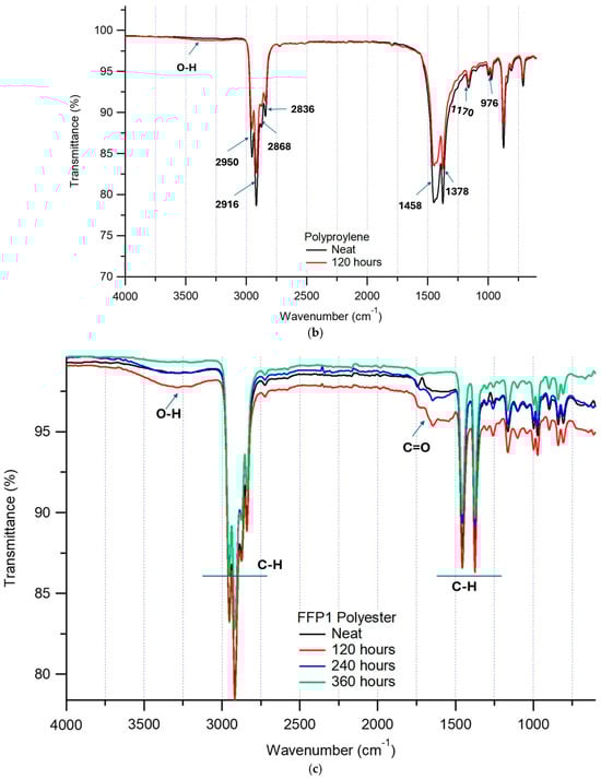 The FTIR results of cloth, surgical and FFP1 masks before and after 120, 240 and 360 h of exposure to the environmental weathering chamber are shown in Figure 2. For the PET cloth mask, there were no significant changes in FTIR spectra as compared to the neat (original) sample for different exposure hours (Figure 2a). The intensities of C-H stretching wavenumbers at 3000–2850, C-H bend 1470 and C-H rock at 1383 and 728 cm−1 did not show any changes after exposure. These results show that PET samples are not degrading with the current exposure hours, where maximum exposure time (360 h) equates to ±180 days. This can be attributed to the high ratio of cross-linked aromatic compounds as compared to the aliphatic compounds, making them resistant to UV degradation [26]. It is expected that the higher exposure of PET under environmental abiotic conditions may undergo chain scission, which leads to low molecular compounds. This mainly occurred at the carbonyl groups (C=O) at 1600–1800 cm−1, but the rate of degradation was mainly influenced by the physical-chemical factors of the PET materials in terms of molecular weight and highly cross-linked aromatic compounds [26].