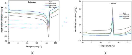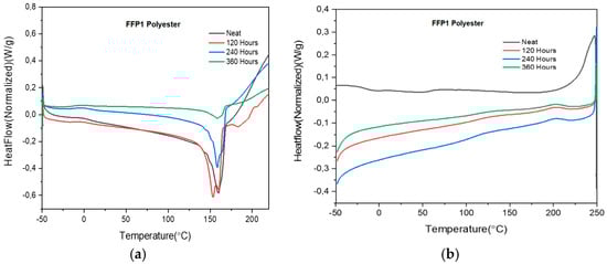 The DSC results of the neat PET cloth mask and mask exposed to 120, 240 and 360 h in the QUV weathering chamber are shown in Table 3. There is not much difference in the melting temperature (Tm), as shown in Figure 4a and the first cold crystallization temperature of the neat PET cloth mask and QUV exposed masks, Figure 4b. There was a 58% decrease in the crystallinity and heat of enthalpy after 120 h of QUV exposure. UV degradation breaks down the orderly polymer chain and induces defects in the molecular chain, resulting in lower crystallinity [28]. These changes indicate that more amorphous regions were created after exposure to UV light and causing chemical degradation in the material [29,30]. Exposure to UV causes chain scission and breaks down the ester bond, which is the backbone of the PET. It further affects by reducing molecular weight and forming more amorphous regions [31,32]. There is not much change in the 240 h QUV exposure as compared to the 120 h exposure. In the 360 h QUV exposure, there were further degradations in the mask samples, with further decreases in the crystallinity and heat of enthalpy. A different glass transition temperature (Tg °C) was observed for both the PET cloth mask and the mask exposed to different hours in QUV. This could be attributed to the different phase shifts in the material, with an initial higher Tg for the neat material and further reduction in Tg as there are continuous changes in the material phases.