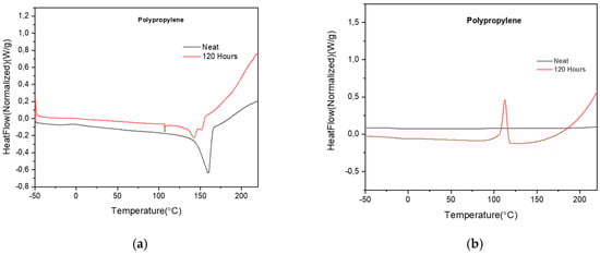 The DSC results of the neat PP surgical mask and the mask exposed to 120, 240 and 360 h in the QUV weathering chamber are shown in Table 4. There is not much difference in the melting temperature (Tm) and first cold crystallization temperature (Tcc1st) of the neat PP surgical masks and the QUV exposed masks (Figure 5a,b), but a significant drop in the crystallinity (88%) and heat of enthalpy (88%) after 120 h of QUV exposure is observed and masks are brittle and fragmented, with some portions of the QUV exposed masks having disintegrated into powder form. The reason is due to both photolytic degradation and the photo-oxidation process happening in the amorphous region, causing chemical degradation (chain scission and free radical formation) in the material and breaking down the carbon-methyl backbone of the polymer chain [33,34]. The breaking down of molecular chains results in a significant decrease in molecular weight [31,32]. These results are similar to the FTIR result as explained in the previous section. Since there was a difference in crystallinity between the neat PP surgical mask and the 120 h QUV exposed mask, it led to different Tg (°C) in different layers.