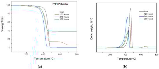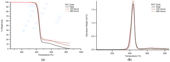 The TGA results of neat PET cloth masks subjected to 120, 240 and 360 h are depicted in Table 6. The weight loss and TGA derivatives curves are shown in Figure 7a,b.