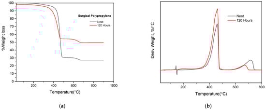 The TGA results of the neat PP surgical mask and 120 h QUV exposed mask are depicted in Table 7. As expected, the neat PP surgical mask has higher Tonset (°C) and Tmax (°C) temperatures as compared to the 120 h QUV exposed mask (Figure 8a,b) due to its higher crystallinity. It creates a stronger bond among the molecular chain and resists thermal degradation. Once masks are exposed to 120 h in QUV, there was a shift in Tonset (°C) and Tmax (°C) temperature values, resulting in lower temperatures due to the thermal degradation of the molecular chains [35]. At 600 °C, 32% residue (by weight %) was left in the case of a neat PP surgical mask and 55% residue was left in the case of 120 h QUV exposed mask. It can be attributed to the presence of additives or fillers in the PP polymer [36].