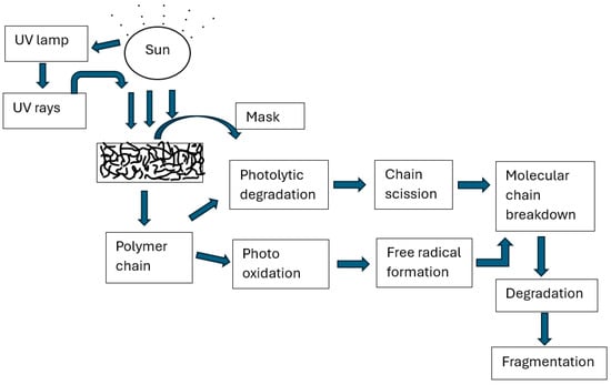 The degradation mechanism of a mask subjected to artificial weathering is depicted in Scheme 1. The mask was subjected to artificial weathering in the QUV chamber. The constituent fibers in the mask and associated polymer chains of the fibers undergo photolytic degradation and photo-oxidation as a result of UV exposure. During the photolytic degradation process, chromophores or impurities in a material absorb UV light at wavelengths above 290 nanometers. This absorption of energy leads to the breakdown of polymer chains and the formation of free radicals. These free radicals can either combine to form more chromophores or initiate photo-oxidation. Since the amorphous region of a material is more vulnerable to oxygen, these degradation reactions predominantly occur there. UV exposure causes chain scission and breaks down the main backbone of the polymer chain. As a result, the mask was brittle, degraded and broken down into fragments [27,28].