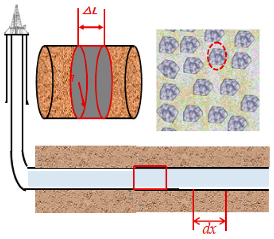 For sedimentary reservoirs formed by rapid accumulation of multi-phase alluvial fans, conglomerate reservoirs often exhibit complex internal structures and strong heterogeneity. During drilling in conglomerate reservoirs, horizontal wells frequently encounter multiple zones with varying gravel sizes and concentrations. To precisely characterize gravel distribution along the wellbore axis, consider an infinitesimal segment dx along the wellbore axis, as illustrated in Figure 1. When this infinitesimal element is sectioned axially, it forms a rectangle. The gravel radius and gravel density are defined on this rectangular infinitesimal element: