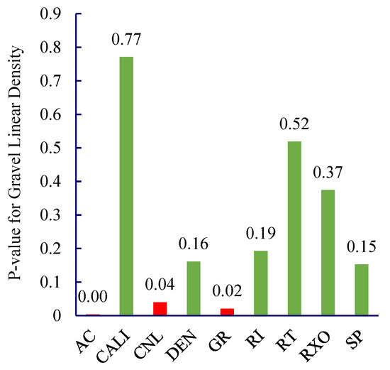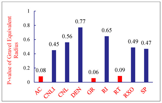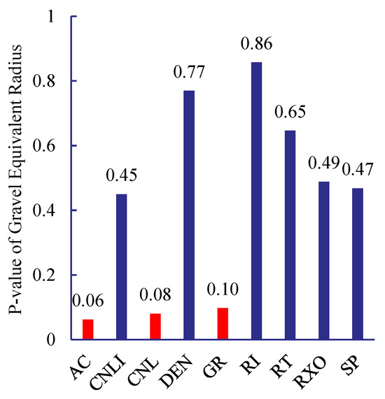 Considering the field operation cycle and costs, FMI imaging logging is not performed on every well. Therefore, it is necessary to establish correlations between conventional logging data and gravel distribution characteristics based on imaging logging interpretation results, thereby characterizing the gravel distribution around horizontal wells under conditions where imaging logging is unavailable. The p-value from statistics is introduced to characterize the association between different types of logging data and gravel linear density and content. The p-value is the probability of observing a test statistic at least as extreme as the current result under the assumption that the null hypothesis is true. In hypothesis testing, the p-value is compared to the significance level α: if p-value < α, the null hypothesis is rejected; otherwise, it is not rejected. Assume the null hypothesis is “There is no relationship between logging curve data and gravel equivalent radius or gravel linear density.” Set the significance level α = 0.1. If p-value < 0.1, reject the null hypothesis at the 0.1 significance level, indicating a statistically significant relationship exists between the logging curve and either the gravel equivalent radius or the gravel linear density. p-value analysis for the three indicators AC, CNL, and GR all yielded values less than 0.1. This indicates statistically significant relationships between these logging curves and gravel characteristics, as illustrated in Figure 5 and Figure 6.