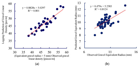 Using multiple regression analysis, predictive models were established for conventional logging curves in the fan area of the JL1 wellbore, relating to gravel equivalent radius and gravel line density, as shown in Equations (3) and (4). Linear regression was performed between the predicted and observed results, verifying a fitting accuracy exceeding 80%, as illustrated in Figure 7.