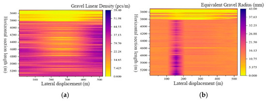 Kriging interpolation characterizes regional gravel line density and equivalent gravel radius size, providing a basis for depicting fracture propagation patterns in horizontal wells within conglomerate reservoirs. forming a “point-line-surface” gravel distribution prediction method, as shown in Figure 8a,b. The vertical axis represents horizontal section length, while the horizontal axis denotes lateral displacement. By determining the color of coordinate points based on the specified horizontal section length and lateral displacement, gravel line density and equivalent gravel radius can be predicted.