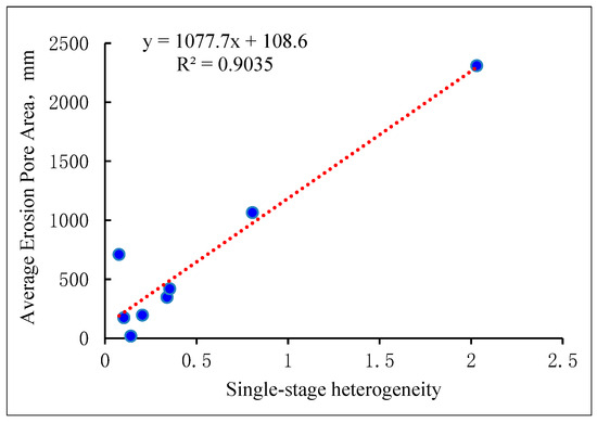The heterogeneity of conglomerate reservoirs is characterized by the product of single-stage gravel line density variance and gravel equivalent radius variance. The reservoir heterogeneity is fitted with the average eroded aperture area from the Eagle Eye test, with the fitting results shown in Figure 9.