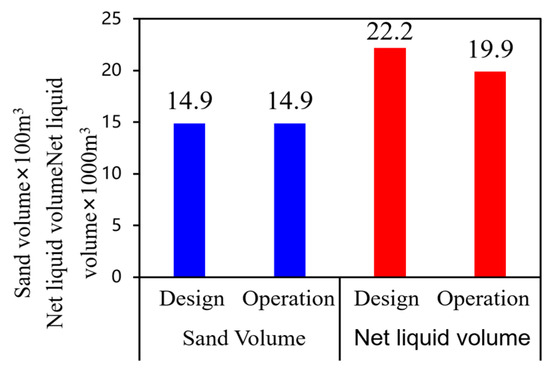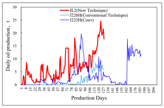 Well J2 employed horizontal well volume fracturing with a pumping rate of 12–14 m3/min. By avoiding areas with high gravel distribution, the operation difficulty was correspondingly lower. Sand injection was completed as designed, achieving a 10% fluid volume saving, as shown in Figure 15. The wellhead pressure was 3–5 MPa lower than that of adjacent wells, and the production performance exceeded that of neighboring wells in the block, as illustrated in Figure 16.
