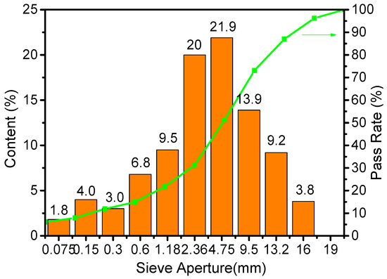 Donghai 70# asphalt was selected, and the following primary technical parameters were shown: Softening point: 53.2 °C; Ductility: 39.8 cm (50 mm/min, 10 °C); Penetration: 64.5 × 0.1 mm (25 °C, 5 s, 100 g); Density at 15 °C: 1.033 g/cm3; RTFOT residual mass change: 0.46%; Residual penetration at 25 °C: 70.2%. The aggregate selected was Jiangxi basalt, which was graded according to the classifications in Figure 1. The water absorption rate of the aggregate was 0.8%, and the crushing value was 8.5% (9.5–13.2 mm). The oil-to-aggregate ratio was set to 4.8%. The density of the asphalt mixture was 2.453 g/cm3.