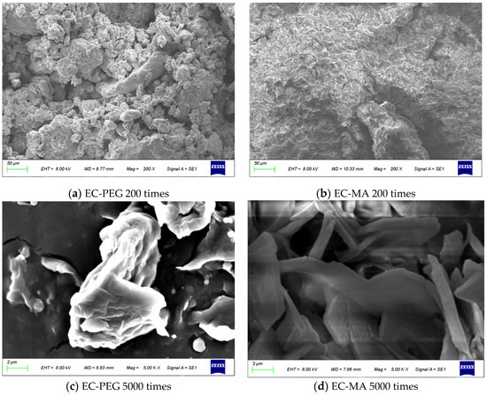 Figure 3b,d displays the morphological features of EC-MA at 200× and 5000× magnification. Figure 3b has revealed that EC-MA particles have consolidated into compact masses with tightly bonded surfaces. Figure 3d has revealed numerous lamellar structures, a characteristic feature formed through the accumulation of MA lamellae on the particle surface. These interlocking lamellae enhanced interparticle bonding, resulting in a denser overall structure that resisted fragmentation. Compared to EC-PEG, EC-MA tended to maintain its original blocky structure during crushing, minimizing the generation of fine particles. This behavior aligned with its particle size distribution, which exhibited a higher proportion of large particles.