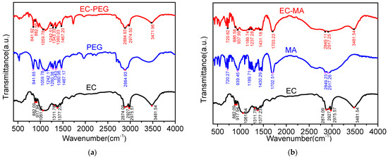 FTIR images: (a) EC, PEG, and EC-PEG spectra; (b) EC, MA, and EC-MA spectra.