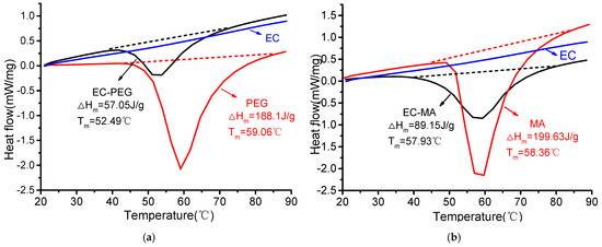 DSC analysis images: (a) EC, PEG, and EC-PEG; (b) EC, MA, and EC-MA.