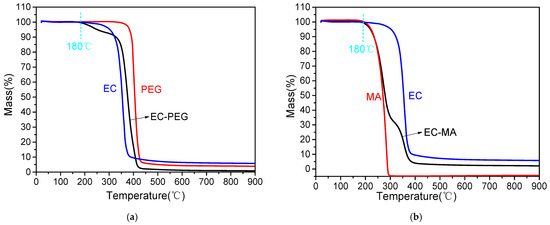 TGA images: (a) EC, PEG, and EC-PEG mass loss; (b) EC, MA, and EC-MA mass loss.