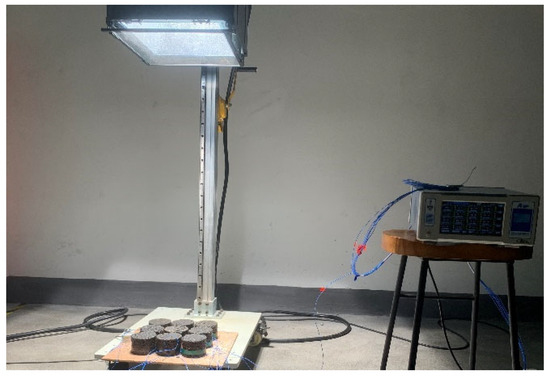 Temperature Cycling Test: Testing was conducted by using Victory Company’s 32-channel temperature measuring instrument. A groove approximately 3 mm wide and 5 mm deep was cut into the center of the lower surface of the Marshall specimen by using a cutting machine. The temperature probe was placed within the groove at the specimen’s center point. The groove was then filled with phase-change asphalt identical to that used for manufacturing the Marshall specimen, securing the temperature probe in place. A 15 mm wide paper strip was then applied over the groove to seal the phase-change asphalt, preventing it from flowing out of the groove at high temperatures. A second probe measuring the specimen’s surface temperature was placed at the center of the specimen’s upper surface. The temperature-measuring instrument recorded data at a frequency of 5 s per measurement. The light source was a 2500 W simulated sunlight source acquired from Suzhou Weishuo Optical Technology Co., Ltd. (Suzhou, Zhejiang, China), positioned at a height of 1 m, with an average irradiance of 1150 W/m2. The ambient test temperature was 17.5 °C. Two on-site tests were conducted, and the average temperature from both tests was taken as the final temperature.