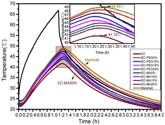 The standard Marshall specimen heated up the fastest and reached the highest temperature, peaking at 48.95 °C. Specimens with EC-PEG dosages of 5%, 10%, 15%, and 20% reached maximum temperatures of 48.34 °C, 46.65 °C, 45.63 °C, and 44.33 °C, respectively, representing temperature reductions of 0.61 °C to 4.62 °C compared to the standard Marshall specimen. Specimens with EC-MA contents of 5%, 10%, 15%, and 20% reached maximum temperatures of 47.5 °C, 44.96 °C, 43.68 °C, and 41.72 °C, respectively, with a cooling range of 1.45 °C to 7.23 °C compared to standard Marshall specimens. At the optimal EC-PEG content, the maximum phase transition temperature difference relative to the standard Marshall specimens was 3.32 °C. At the optimal EC-MA content, the maximum phase transition temperature difference compared to the standard Marshall specimens was 7.23 °C. EC-MA demonstrated superior temperature control performance compared to EC-PEG.