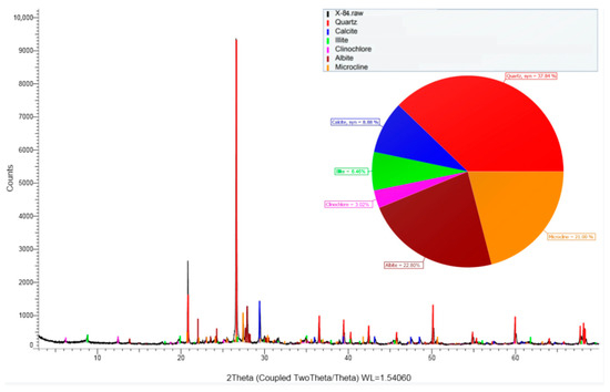 Rock samples were collected from the target stratum of a gas storage reservoir, with brown siltstone as the predominant lithology. All core samples were obtained from a depth interval of 2955.0–3016.8 m and meticulously processed into standard cylindrical specimens (Φ25 mm × 50 mm). After polishing, the specimens displayed uniform, fine-grained surfaces, flat end faces, and no visible natural fractures. XRD analysis (Figure 1) indicates that the primary constituents of sandstone in this stratum are quartz (37.84%), sodium feldspar (22.81%), and microcline feldspar (21%), with minor quantities of calcite and clay minerals. Porosity and permeability measurements show that the representative samples possess an average porosity of 16.76% and a gas permeability of 0.6329 mD (As shown in Table 1). These results indicate that the reservoir is of low permeability, exhibiting a weak correlation between porosity and permeability. To evaluate sample homogeneity and minimize experimental variability, wave velocity measurements were performed on all rock specimens. The measured velocities ranged from 2401.77 to 2607.3 m/s, indicating overall good consistency among the specimens.