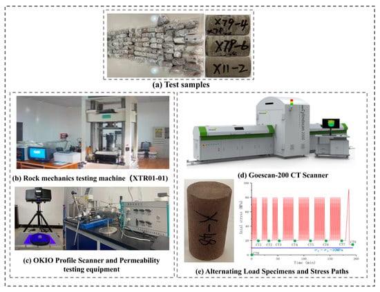 On the other hand, periodic injection and withdrawal operations during reservoir exploitation impose long-term alternating loads on the tight sandstone formation, leading to progressive fatigue damage in its mechanical properties [19]. However, current studies remain limited in their ability to fully elucidate the entire process of damage evolution. Acoustic emission (AE) monitoring provides an effective means to capture the spatiotemporal evolution of microfractures through ringing counts, energy release, and localization data [20]. Nevertheless, direct characterization of pore structure and crack morphology remains challenging. Nuclear magnetic resonance (NMR) technology enables precise quantification of pore size distribution and fluid occupancy, providing distinct advantages for characterizing micropore evolution [21]. However, its spatial resolution remains relatively low, limiting the ability to achieve three-dimensional localization and visualization. Although scanning electron microscopy (SEM) provides microscopic morphological information at the micrometer to nanometer scale, revealing cracks between mineral grains and damage to cementing materials, its observational scope is limited [22]. Typically restricted to localized sampling of post-experimental fracture surfaces, SEM cannot achieve real-time, full-field monitoring. The introduction of real-time X-ray computed tomography (real-time CT) provides a breakthrough solution to this limitation. Compared to the aforementioned methods, real-time CT offers distinct advantages, being non-destructive, three-dimensional, dynamic, and quantitative [23,24]. It synchronizes with mechanical loading equipment to dynamically capture the initiation, propagation, and closure of microcracks throughout the stress–strain process, while simultaneously enabling precise calculation of overall porosity and damage distribution via grayscale analysis and three-dimensional reconstruction. This permits visual tracking of damage evolution pathways [25,26]. Therefore, integrating CT scanning with triaxial mechanical testing allows for the “freezing” and in situ observation of damage during loading, offering direct evidence for elucidating rock failure mechanisms.