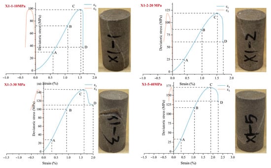 Figure 3 presents the complete stress–strain curves of the X1 series samples under varying confining pressures, fully characterizing the mechanical response of the rock throughout the entire process, from initial deformation to ultimate failure. The test results indicate that the complete stress–strain curve can be divided into four distinct phases: Phase I (OA) represents the primary microfracture consolidation stage, characterized by concave nonlinear deformation; Phase II (AB) denotes the linear elastic stage, in which stress and strain exhibit an approximately linear relationship; Phase III (BC) corresponds to the plastic yielding stage, where the curve gradually deviates from linearity; Phase IV (CD) represents the post-peak stress drop and failure stage, illustrating the progressive loss of the rock’s bearing capacity.