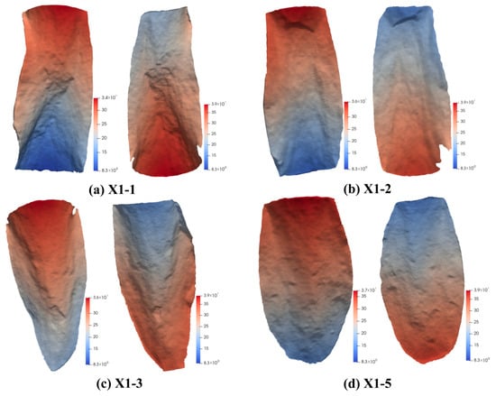 The results of the shear plane reconstruction are shown in Figure 4, and the corresponding fractal dimension values are summarized in Table 4. The analysis reveals that the fractal dimension () of all fault planes ranges from 2.1091 to 2.2699, indicating a relatively low degree of overall roughness. This finding suggests that the topographic morphology of the fault planes exhibits relatively gentle and smooth undulations. Minor variations were still observed among the specimens, with sample X1-3 exhibiting the highest average fractal dimension (2.2246), indicating relatively greater roughness on its fault surface. Conversely, sample X1-5 exhibited the lowest average value (2.1626), suggesting a smoother fault plane. Overall, the fractal dimensions of the fracture surfaces were approximately 2, reflecting a geometric morphology more akin to a two-dimensional smooth surface rather than a highly irregular one. This relatively low degree of roughness facilitated the rapid closure of fracture surfaces under high confining pressure, resulting in a significant reduction in permeability.