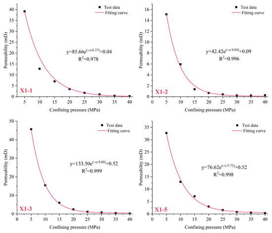 Figure 5 illustrates the evolution of permeability in the samples under different confining pressures. The results show that all specimens exhibited pronounced stress sensitivity in permeability, which decreased exponentially as confining pressure increased from 5 MPa to 40 MPa. As the confining pressure increased, the previously opened macroscopic fracture surfaces progressively closed, resulting in tighter contact between the hanging wall and footwall of the faults. This led to a stepwise reduction in permeability. When the confining pressure reached 40 MPa, the fracture closure effect became dominant. The permeability differences among fault surfaces with different roughness values were significantly reduced, ultimately converging to the same order of magnitude. This phenomenon indicated that under high-stress conditions, such as those encountered during the long-term operation of underground gas storage reservoirs, even highly rough fault surfaces exhibited a markedly reduced flow capacity, thereby ensuring excellent sealing performance of the fault zones.