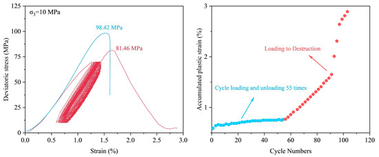 Figure 6 shows the stress–strain response of sample X48 under 10 MPa confining pressure and 55 cycles of loading and unloading (20–80 MPa). Compared to conventional triaxial loading paths, the alternating loading inflicted significant fatigue damage on the rock sample, causing its peak strength to decrease from 98.42 MPa to 81.46 MPa, representing a strength degradation rate of 17.23%. This result confirms that cyclic injection and withdrawal operations during reservoir service significantly weaken the mechanical bearing capacity of sandstone formations. Further analysis of the deformation behavior reveals that during cyclic loading and unloading, the cumulative plastic strain exhibits a distinct steady-state evolution trend. Once the final loading cycle proceeds to failure, the cumulative plastic strain increases sharply.