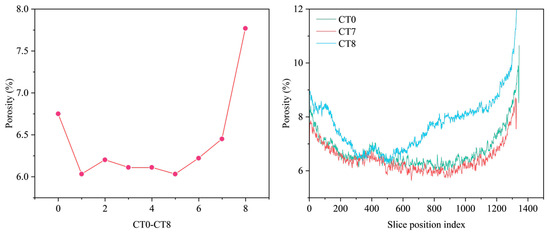 To further elucidate the spatial distribution characteristics of damage, quantitative porosity analysis was conducted on CT grayscale images obtained at the initial state (CT0), after the 55th cycle (CT7), and after ultimate failure (CT8) (Figure 7). The results indicate that after 55 cycles, the overall porosity of the specimen slightly decreased compared with the initial state, suggesting that cyclic loading exerted a limited influence on the sandstone pore structure during the early stage. However, following ultimate failure, the spatial distribution of porosity changed significantly. The primary increases were concentrated within the first 250 and last 700 slices of the specimen, clearly demonstrating that macroscopic fracturing predominantly occurred at both ends of the specimen.