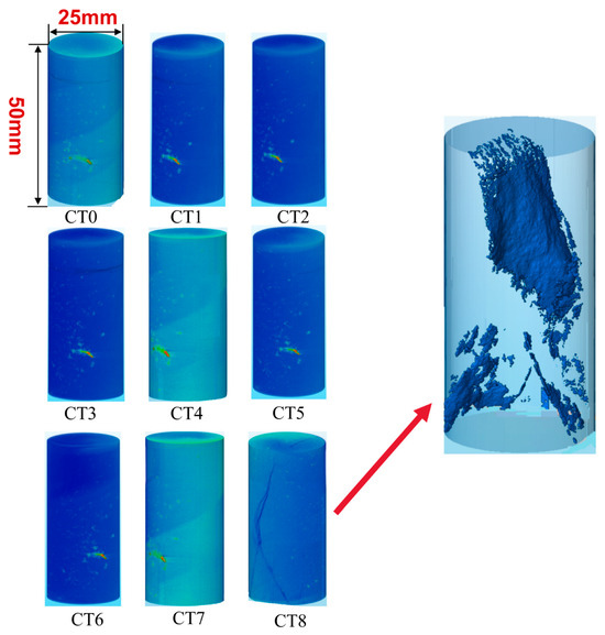 Analysis of the CT image series acquired during cyclic loading and unloading (Figure 8) clearly illustrates the entire evolution process of internal damage within the sandstone specimen. The internal damage progressively nucleates, propagates, and eventually coalesces as the number of cycles increases. At the early stage of the experiment, the CT images displayed only sparsely distributed primary micropores, while the overall structure of the specimen remained largely intact. As the number of cycles increased, localized microcrack nucleation became apparent, and the cracks progressively oriented along the direction of maximum principal stress. By cycles 45–55, these microcracks further propagated and coalesced, forming regionally interconnected zones. Ultimately, during the failure stage, these interconnected zones merged into a dominant macroscopic shear fracture, exhibiting a typical oblique shear pattern accompanied by secondary branch cracks.