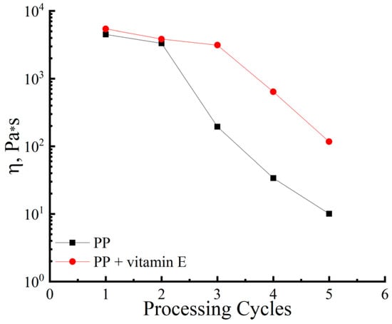 Despite the potential of Vitamin E as a PP melt stabilizer, its use in recycled PP systems has not yet been adequately studied. Furthermore, there are few studies in the literature on the rheological behavior of melts containing Vitamin E and its effect on viscoelastic properties. This raises the question of how the Vitamin E dosage would alter the rheological behavior of PP melts throughout repeated processing (at least five cycles).