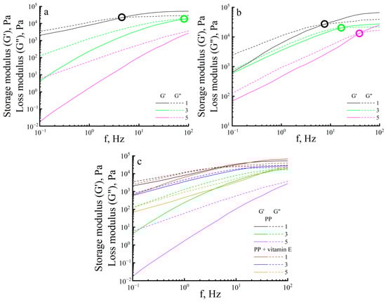 Dependences of the storage modulus (G′) and the loss modulus (G″) on the frequency for PP melts (a) and systems with Vitamin E (b) after several passes; (c) combined data. The number of passes of the systems is indicated in the figure.