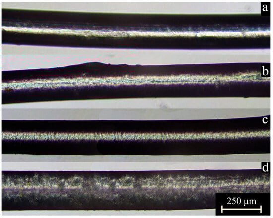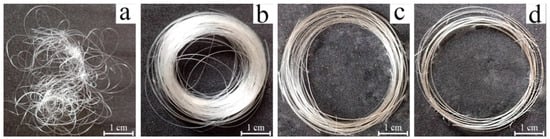 The mechanical properties of the macrofibers were evaluated using an Instron 1122 tensile testing machine (Instron, Norwood, MA, USA). The macrofibers’ deformation rate was 500 mm/min. The macrofibers for tensile testing were cut into staple fibers with lengths of 30 mm. The initial distance between grips was 10 mm. The diameter of the macrofiber was measured using a MITUTOYO Digimatic IP65 electronic micrometer (Mitutoyo Digimatic, Kanagawa, Japan).