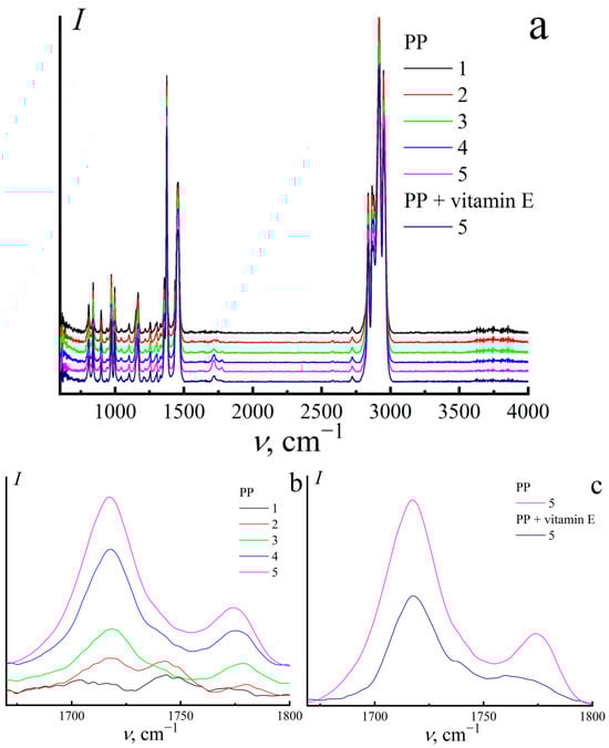 Bands in the region of 800–1000 cm−1 are observed for all spectra, which indicates the preservation of an ordered supramolecular structure in PP due to conformational regularity. The presence of peaks in this region indicates a slight degradation in the system [52]. The intensity of the bands 1452 and 1375 cm−1 (by asymmetric deformation vibrations of the methylene and methyl groups, respectively) increases with the increasing number of treatment cycles, which may indicate a break in the polymer chain during repeated treatment of the system [53]. Thus, the short processing time of PP at 185 °C is reflected in the presented spectra, but to a lesser extent than under more severe conditions (higher temperatures). According to [53], at a higher number of processing cycles, the intensity of the carbonyl group at 1720 cm−1 increased due to the oxidative degradation. As can be seen from the presented spectra for melts without Vitamin E, the intensity of the band at 1720 cm−1 increased gradually with the number of processing cycles (Figure 9b). The maximum intensity of this band is achieved at the fifth processing cycle. For systems with Vitamin E, after five cycles, the intensity of this band is lower compared to the melt without the antioxidant with the same number of processing cycles (Figure 9c).