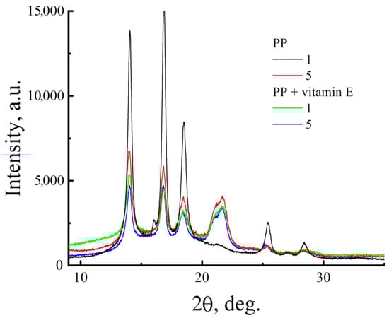 After a few passes, the XRD transmission patterns of PP macrofibers and macrofibers containing Vitamin E show comparable curves (Figure 10). The presented diffractograms for macrofibers show characteristic reflexes for the α-crystalline phase of polypropylene in the 2θ region 14.3°, 17.1°, 18.7°, 21.8°, and 25.7°, corresponding to the planes (110), (040), (130), (131)/(041), and (060), respectively [54,55]. The intensity of reflexes decreases significantly with an increase in the number of PP passes without a stabilizer. For vitamin E systems, an increase in the number of processing cycles leads to a slight change in the intensity of reflexes.