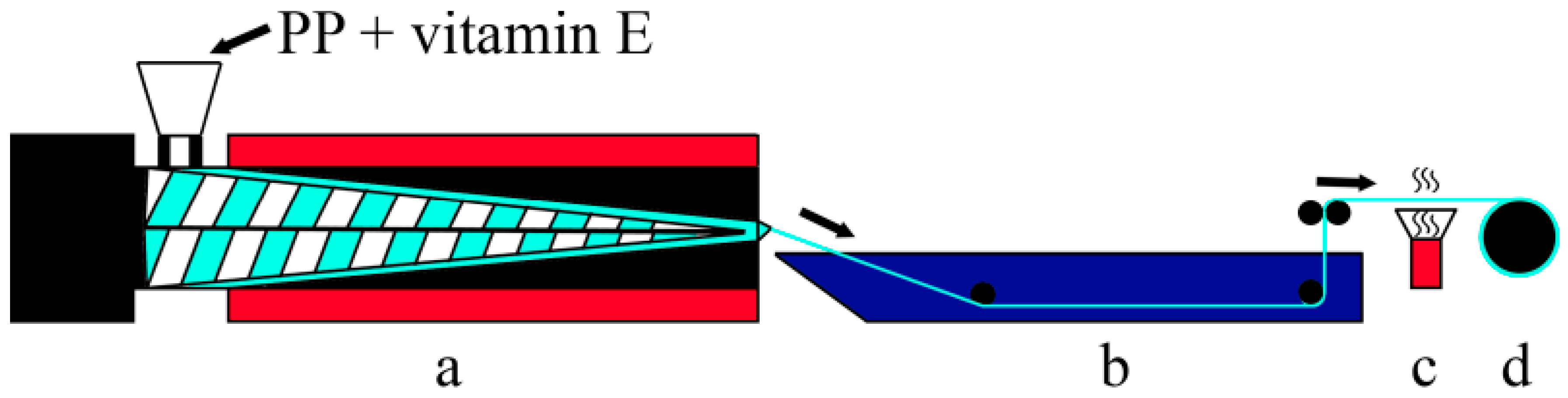 - Al-Malaika, S.; Goodwin, C.; Issenhuth, S.; Burdick, D. The antioxidant role of α-tocopherol in polymers II. Melt stabilising effect in polypropylene. Polym. Degrad. Stab. 1999, 64, 145–156. [Google Scholar] [CrossRef]