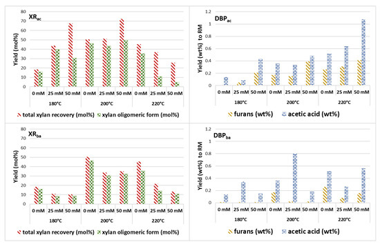 The impact of the acid catalysis on xylan recovery yield (panel XRac) and on the dehydration by-product formation (panel DBPac) in the liquid fractions compared with the xylan distribution (panel XRba) and dehydration by-product formation (panel DBPba) resulted from the effect of base catalysis. XR was the yield determined with respect to the initial xylan in the raw material, while DBP was calculated with respect to dry raw material (wt% to RM).